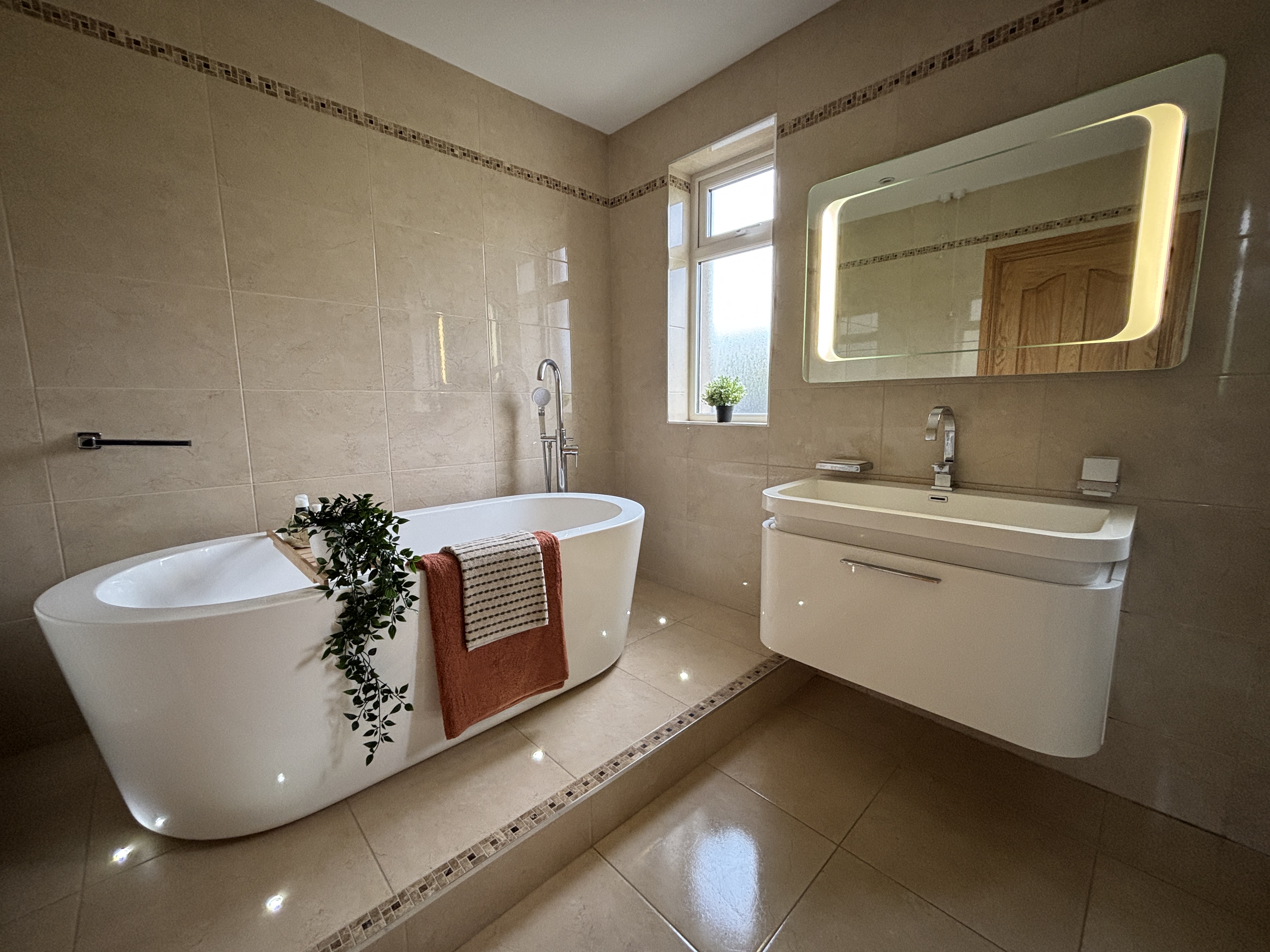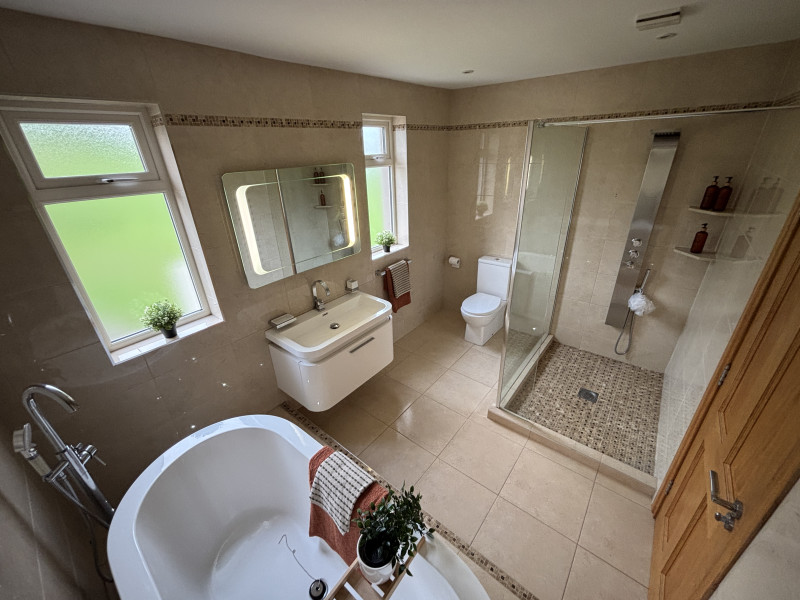 - Free-standing bath with floor fitted mixer tap, shower cubicle, wash hand basin with vanity unit, low flush wc, fully tiled tiled, spotlights.