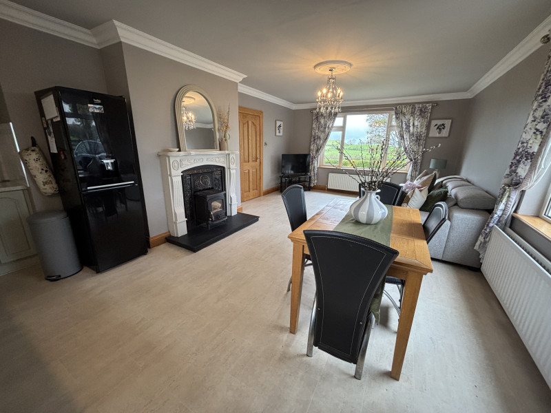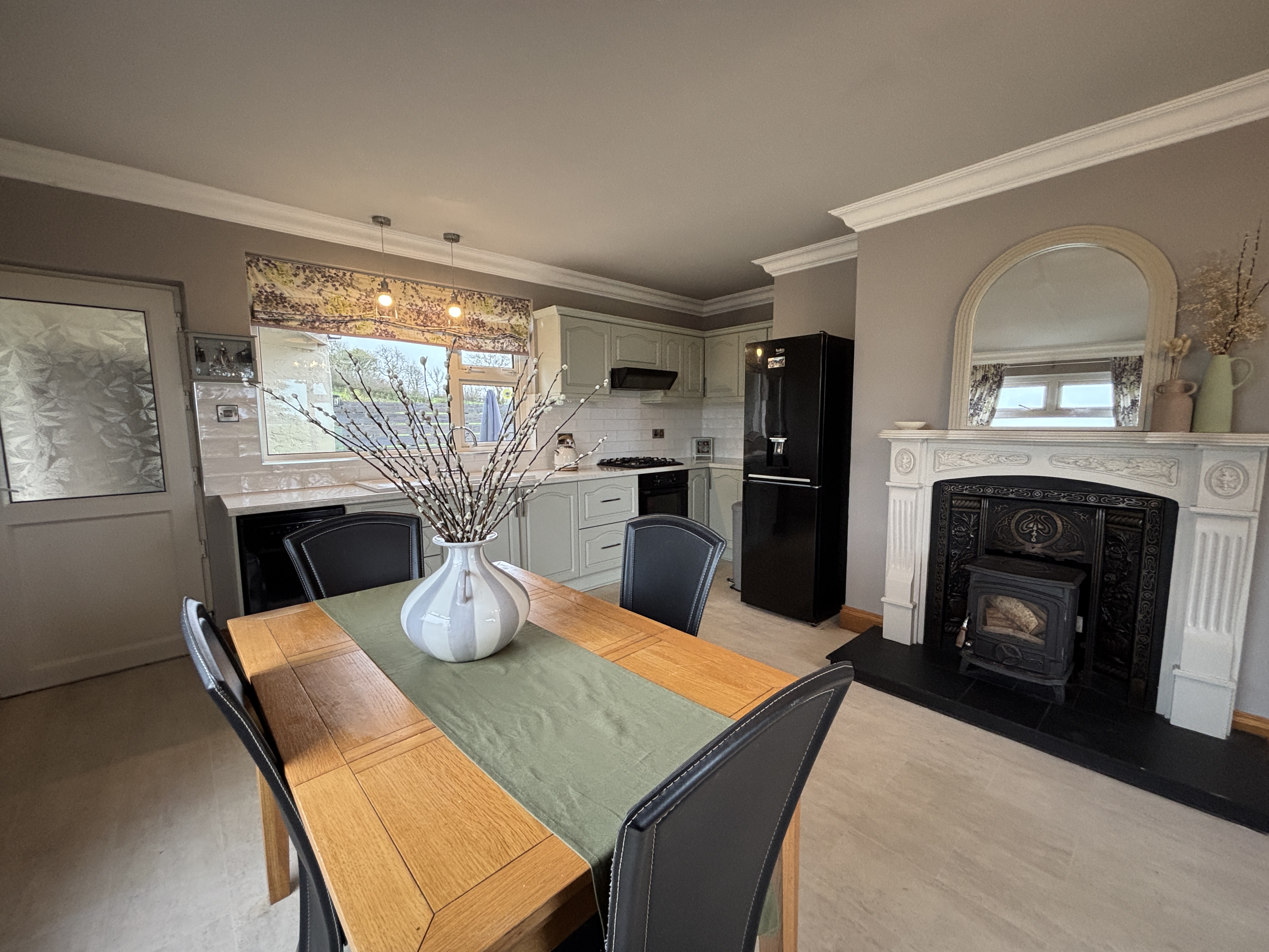- Range of high and low level units, laminate worktops, single drainer sink with side drainer and chrome tap, lino flooring, plumbed for dish washer, built-in gas hob, with built-in extractor fan and built-in single oven and grill below. Feature fire. Ample space for casual living / dining.