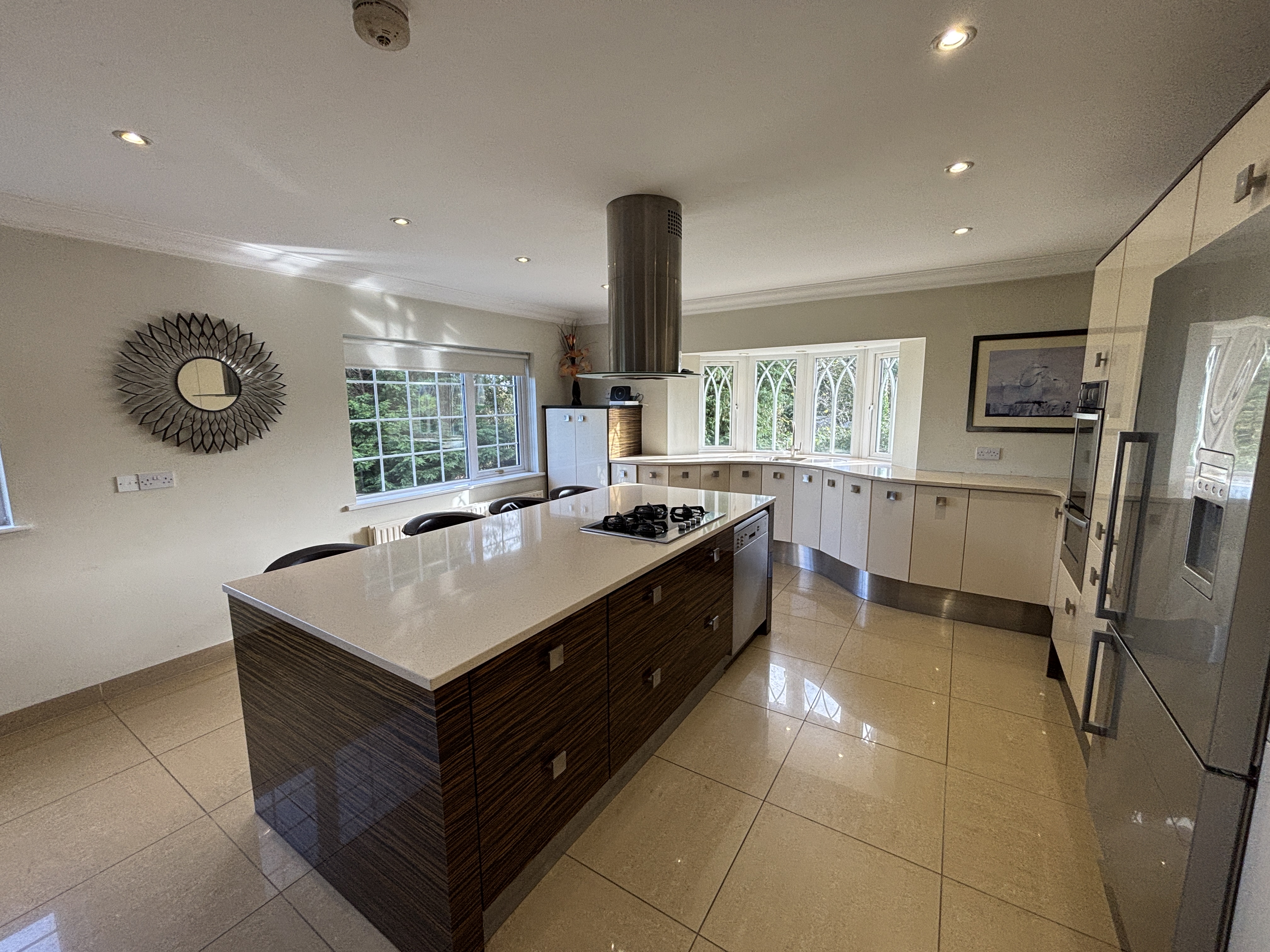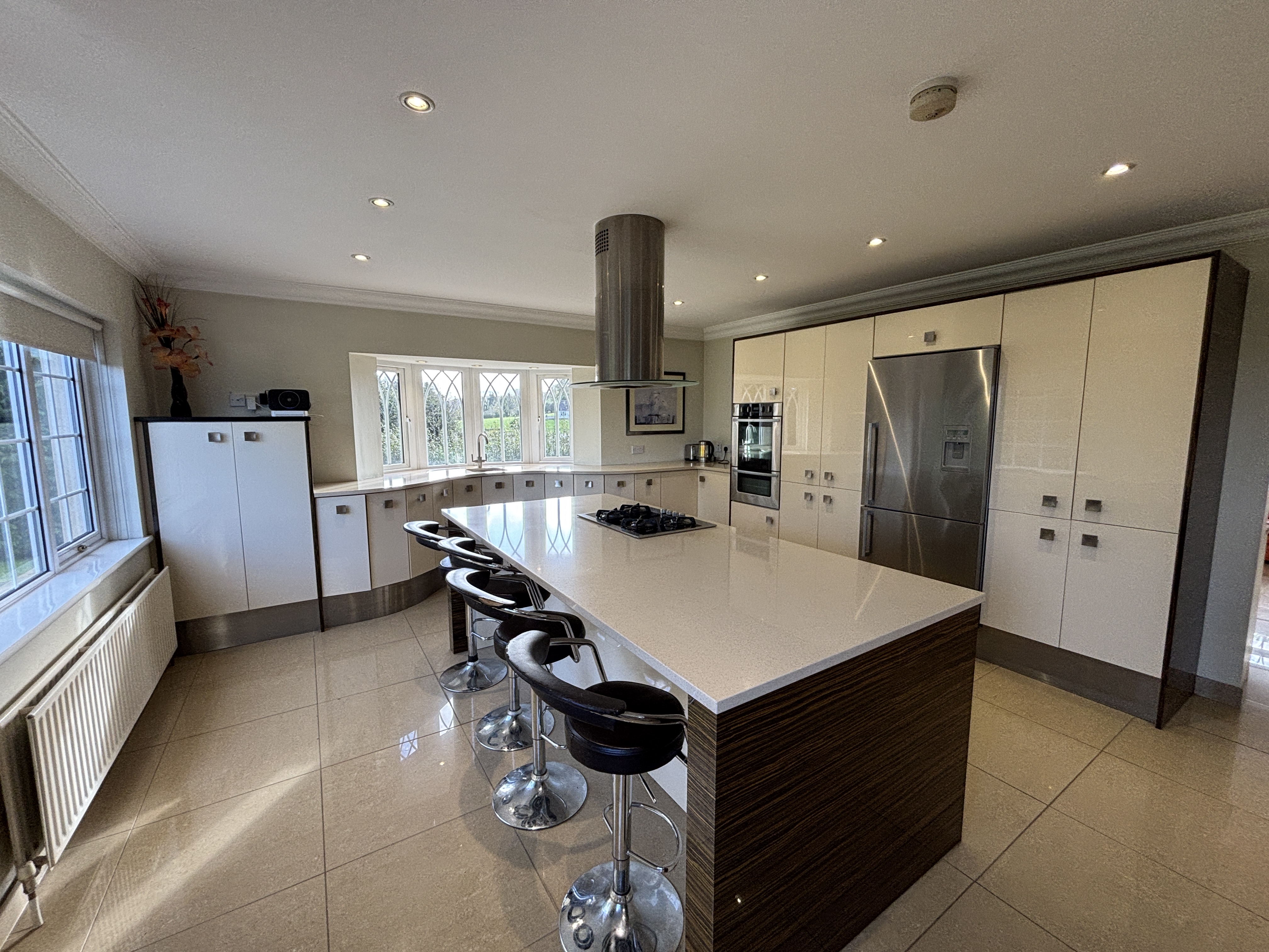 - A flexible, comfortable double aspect space. Contemporary fitted kitchen offering excellent high- and low-level storage. Includes sink with drainer, a 4-ring gas hob with stainless steel extractor fan. Integrated dishwasher and American fridge freezer, ceramic tiled flooring, cornice coving and recessed lighting.