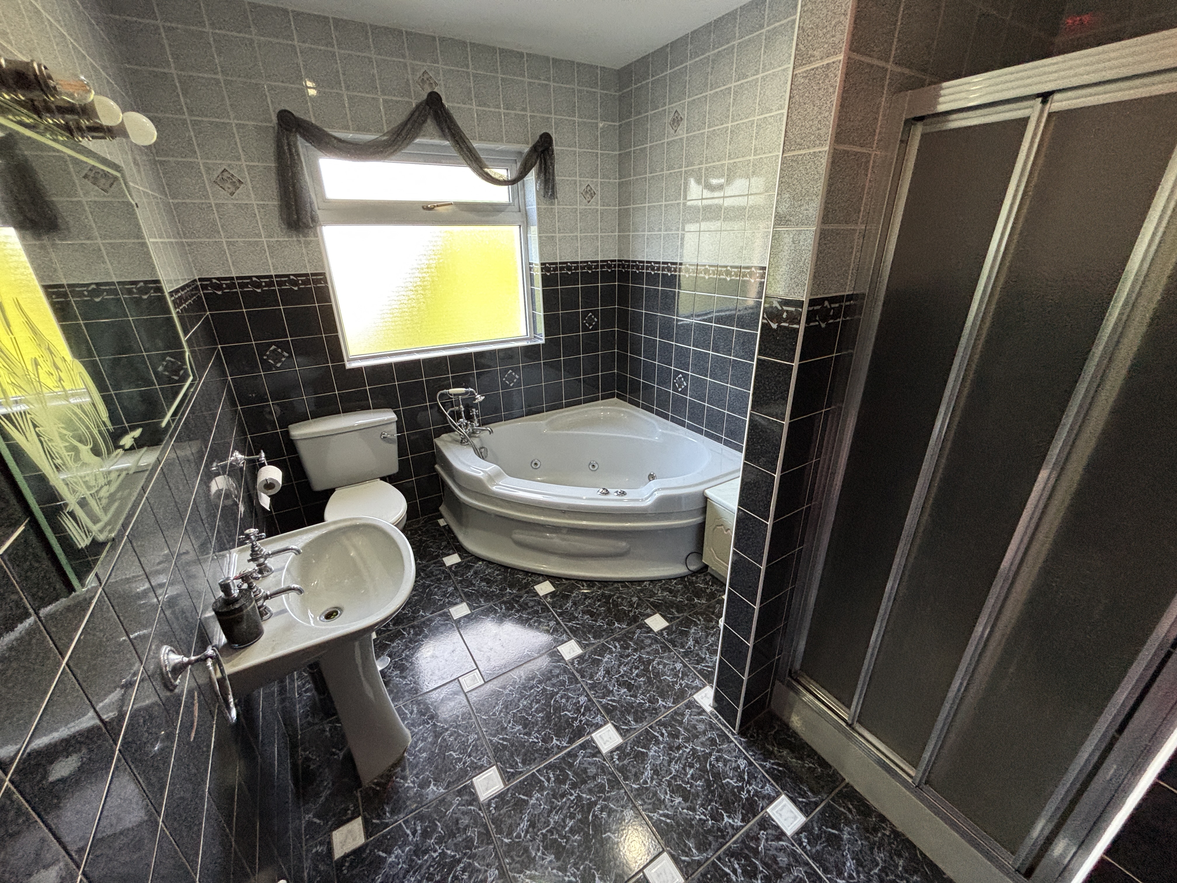 - Luxurious four-piece suite including shower cubicle with stainless steel mixer tap, W.C., jacuzzi bath with mixer taps, pedestal basin, fully tiled walls & flooring.
