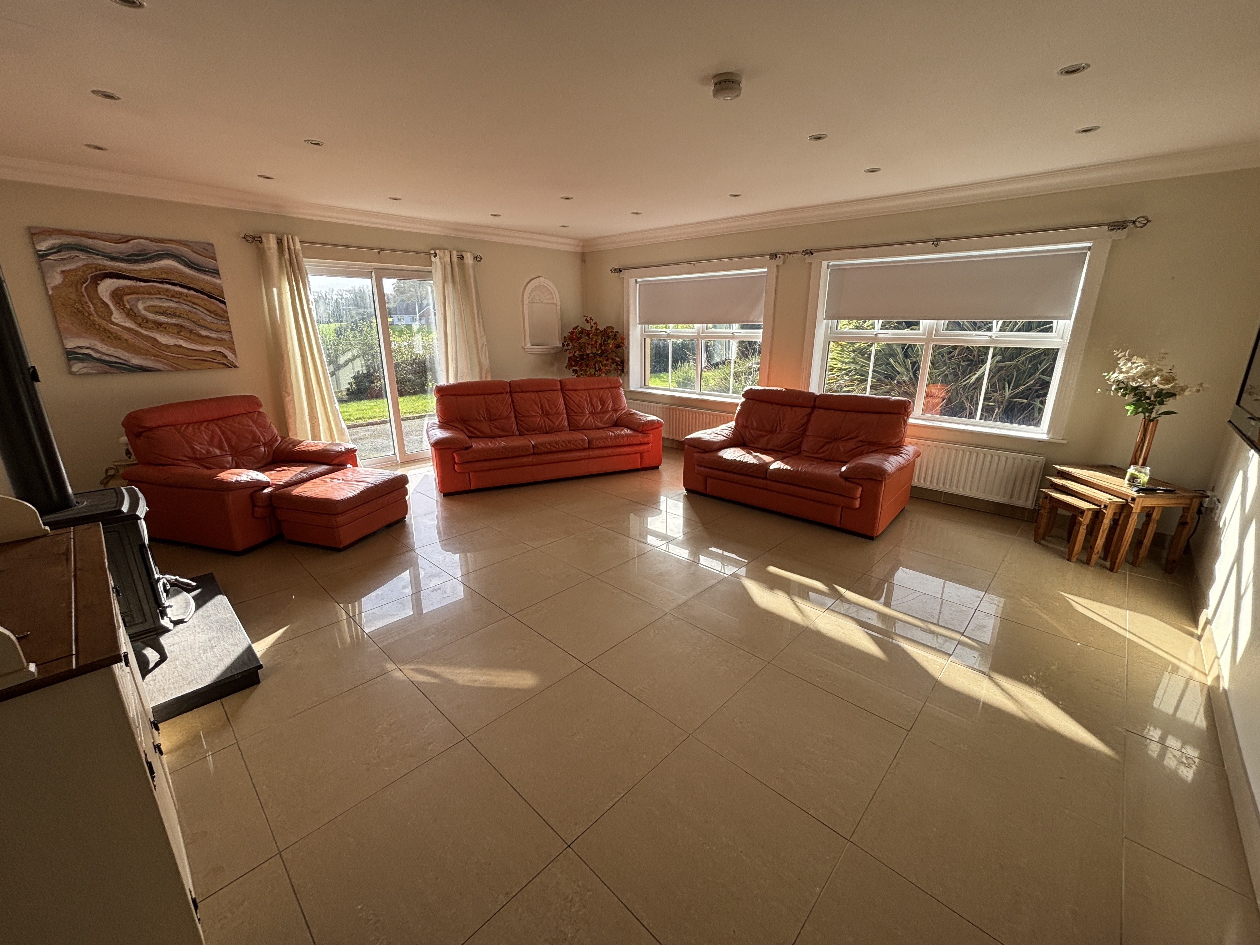 - Spacious and bright double aspect room with wood burning stove. Cornice coving, recessed lighting, ceramic tiled flooring.