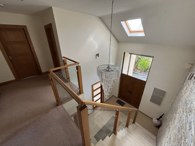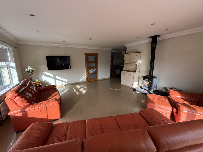 A pillared entrance opens to a sweeping driveway with ample parking, leading to the impressive home beyond. Inside, the spacious and versatile accommodation features open plan living / dining /kitchen areas, designed for comfort and flexibility from family gatherings to quiet relaxation. The living space is enhanced by a feature wood burning stove, adding warmth to the heart of the home.