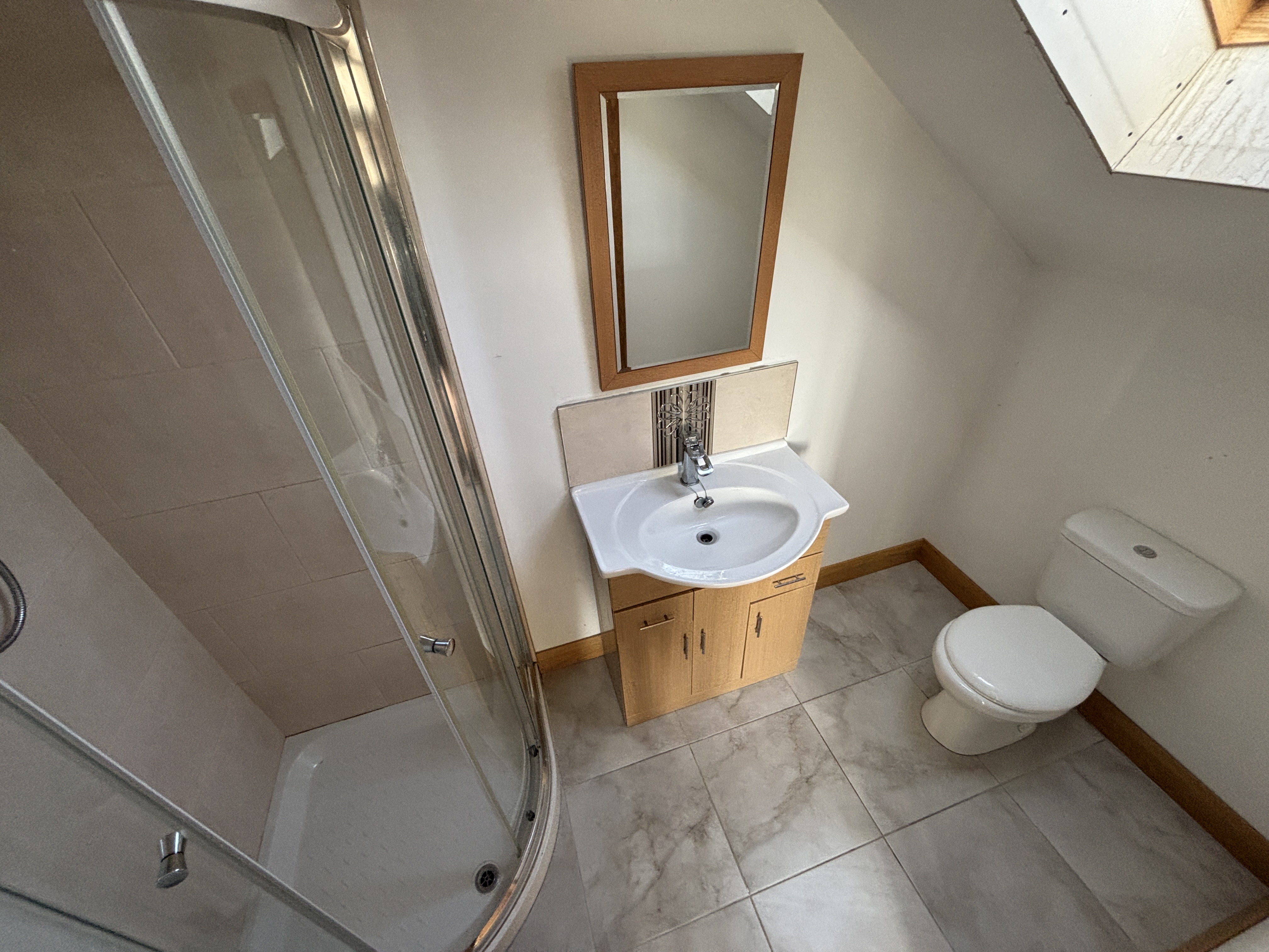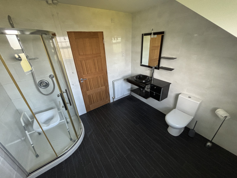 - Stylish suite featuring low flush W.C., vanity wash hand basin with mixer taps, walk-in shower cubicle with mixer shower. Lino flooring.